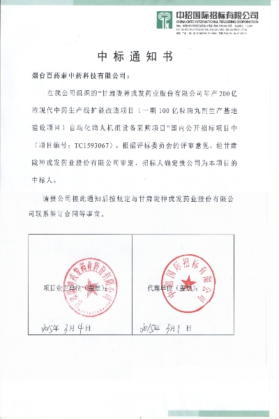 2015年2月12日,中招國(guó)際招標(biāo)有限公司受甘肅隴神戎發(fā)藥業(yè)股份有限公司委托,對(duì)年產(chǎn)200億粒滴丸劑生產(chǎn)線擴(kuò)能改造項(xiàng)目(一期100億粒滴丸劑生產(chǎn)基地建設(shè)項(xiàng)目)2條滴丸機(jī)生產(chǎn)線公開(kāi)招標(biāo),我司中標(biāo)。據(jù)悉,2014年隴神戎發(fā)藥業(yè)元胡止痛滴丸銷售額3.1億元, 是國(guó)內(nèi)單一滴丸品種年銷售過(guò)億元的3個(gè)品種之一。